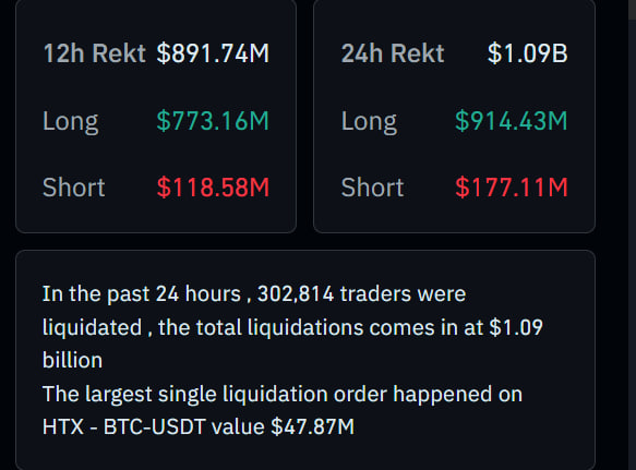 Coinglass data shows liquidations surged past $1 billion over the past 24 hours.