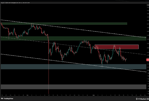 The daily chart still reflects a downtrend following the rejection from $2.698, marked by lower highs and heavy sell-volume during the fall toward $2.07.